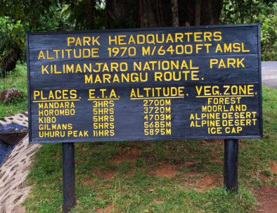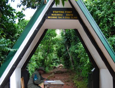 Leave Moshi town about 08:30am and drive to about 45 minutes to Marangu Gate on the eastern side of Kilimanjaro. Do the necessary paperwork at the park gate such as registrations. Begin hiking at about 9:30 am. Hike through rainforest from the park gate (6000 ft) to Mandara Hut (9000 ft), taking about 3 – 4 hours. Stop half way for lunch. Reach Mandara Huts at about 01.30 pm. After short tour at the hut and start coming down to Marangu gate and you may reach at the gate around 04:45 pm. A side trip to Maundi Crater (about 15 minutes away) is a good way to see the surroundings as well as views of Kenya and Northern Tanzania. Return Moshi and will arrive in the late evening around 06:45 pm.